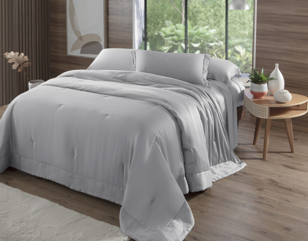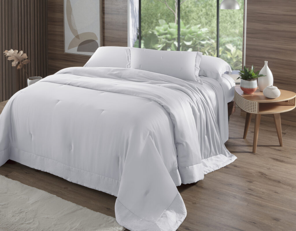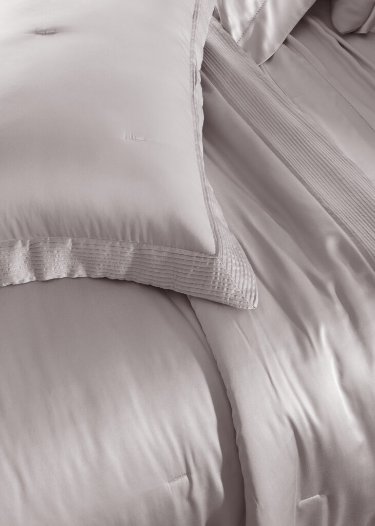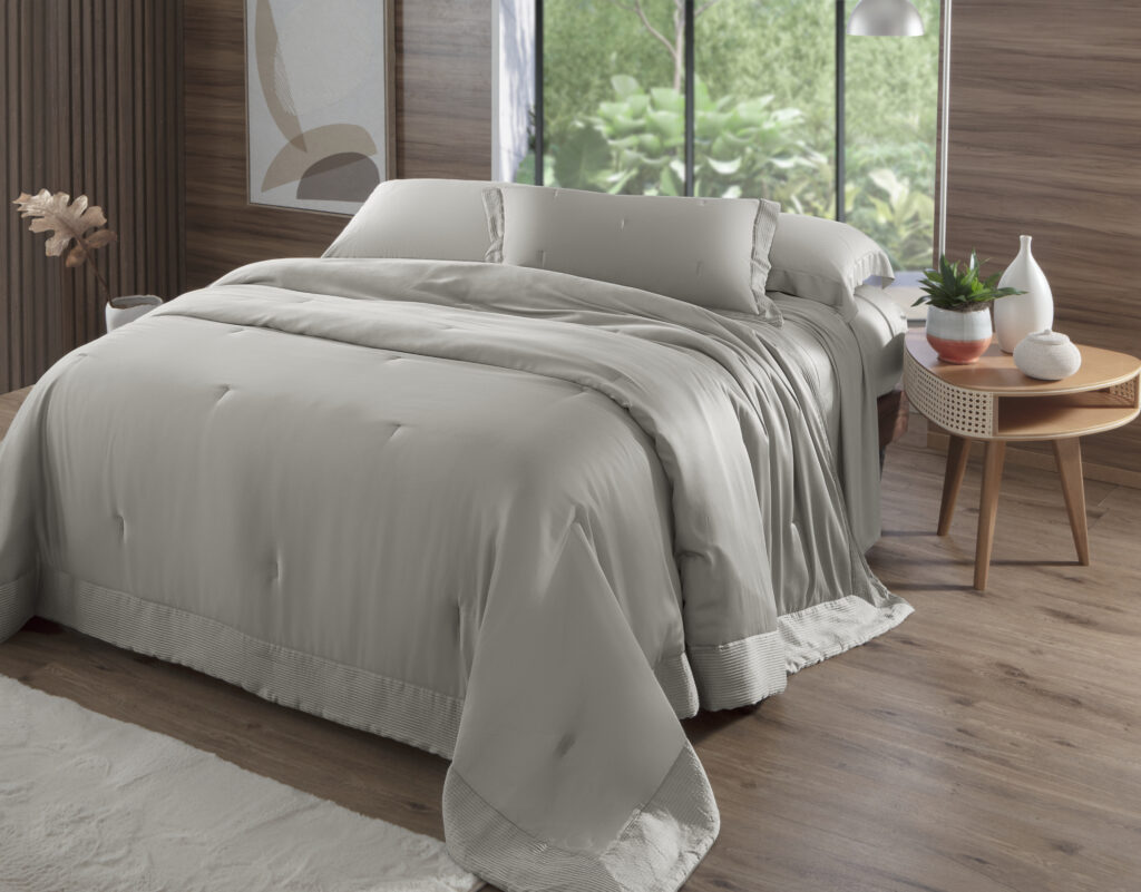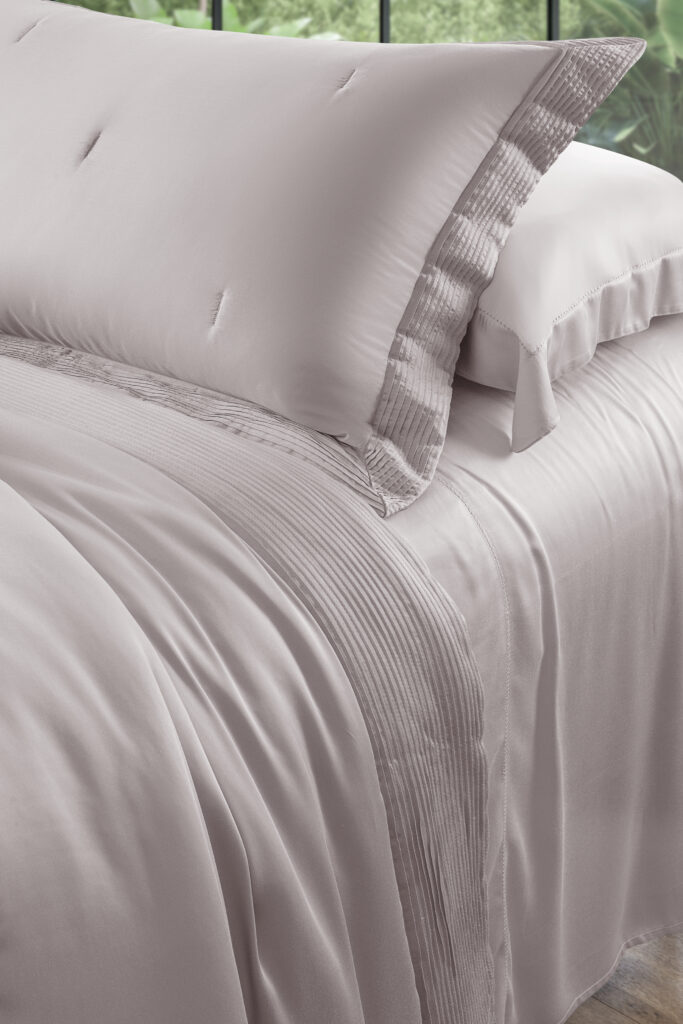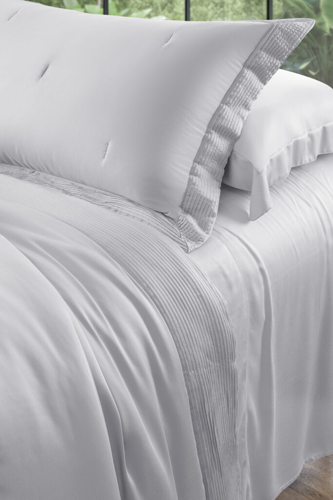 Confeccionada com fibra de bambu 400 fios percal, garantindo um inigualável toque de cetim, extremamente macio e confortável. Colcha com acabamento em aba preguiada.
