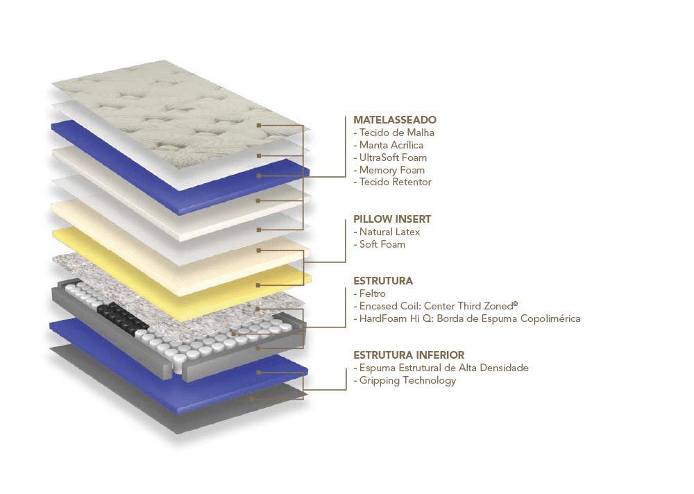 Espuma Ultrasoft Foam é uma camada adicional de alta resiliência e suporte. Esta espuma possui alta performance e maciez, adapta-se perfeitamente aos contornos do corpo, proporcionando o máximo de conforto.