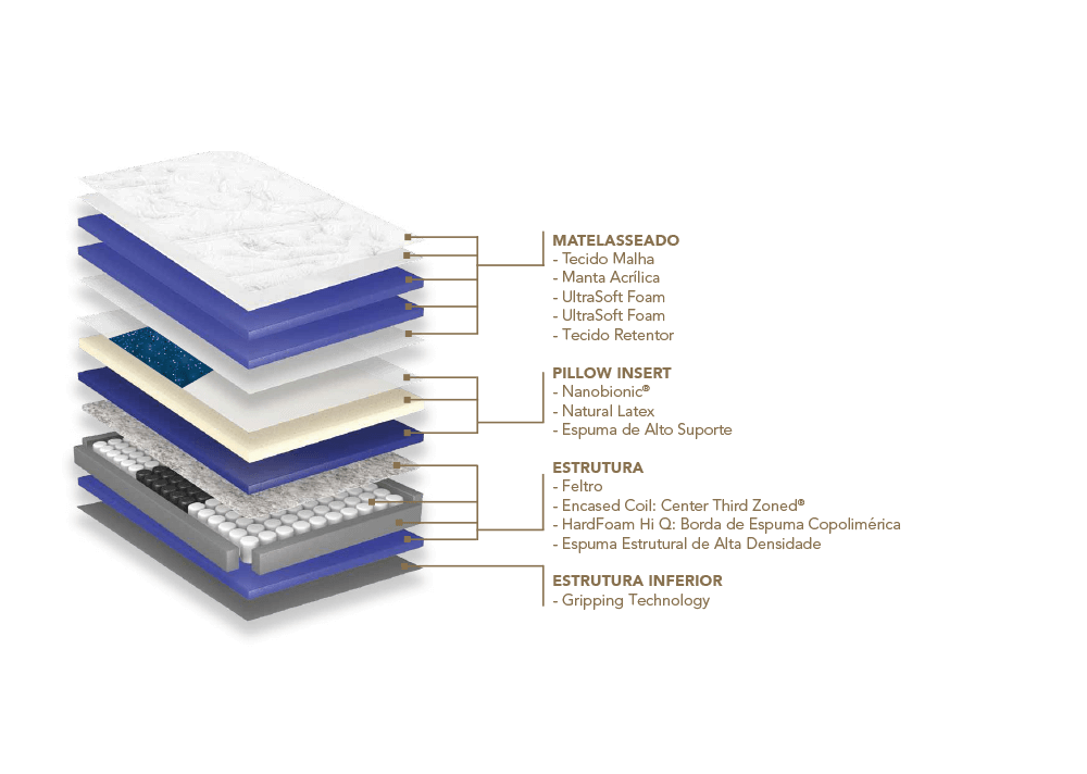 Espuma Ultrasoft Foam é uma camada adicional de alta resiliência e suporte. Esta espuma possui alta performance e maciez, adapta-se perfeitamente aos contornos do corpo, proporcionando o máximo de conforto.