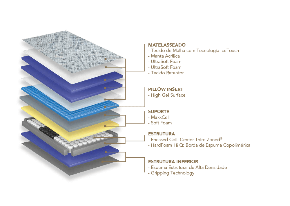 Espuma Ultrasoft Foam é uma camada adicional de alta resiliência e suporte. Esta espuma possui alta performance e maciez, adapta-se perfeitamente aos contornos do corpo, proporcionando o máximo de conforto.