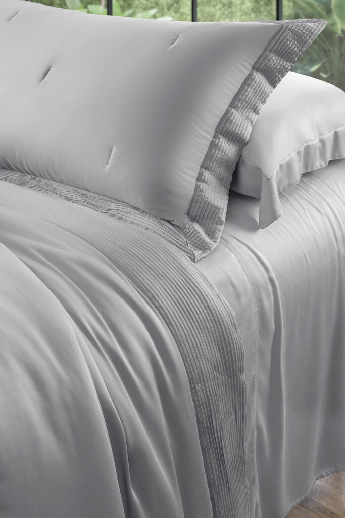 Confeccionada com fibra de bambu 400 fios percal, garantindo um inigualável toque de cetim, extremamente macio e confortável. Colcha com acabamento em aba preguiada.